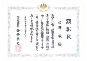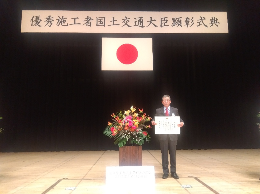 2025年10月28日、国土交通大臣より、当社の職員が「優秀施工者国土交通大臣顕彰」を受賞しました。 現場の第一線で「ものづくり」に直接従事しており、特に優秀な技術・技能を持ち、後進の指導や育成等に貢献している建設技術者として認められました。 表彰を励みとし、全社一丸となって今後もより良い工事を目指し尽力いたします。